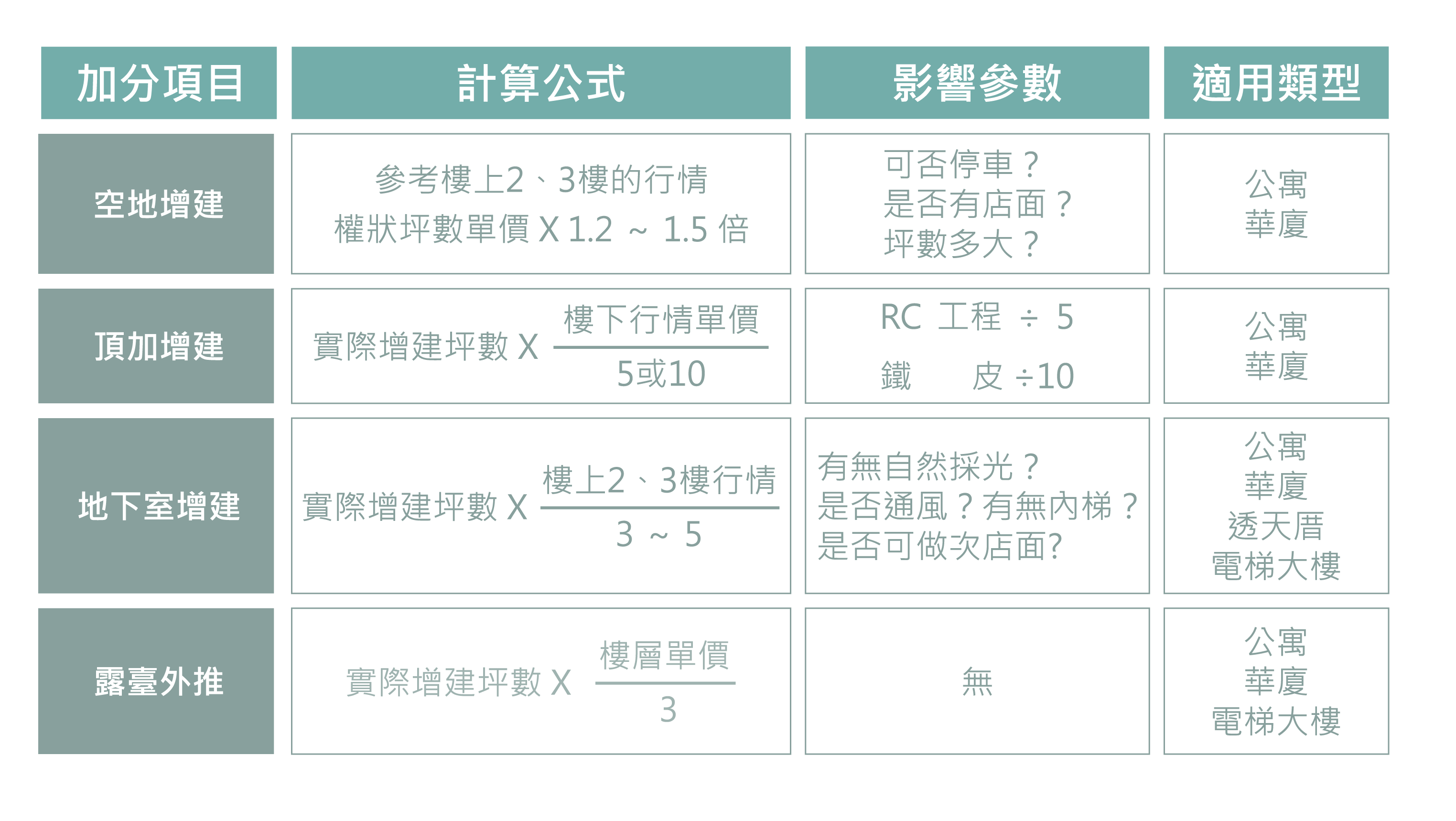 包含空地增建、頂加增建、地下室增建、露臺外推、平台外推、夾層、挑高等等的都有加分效果,每項增建的算法也不同。