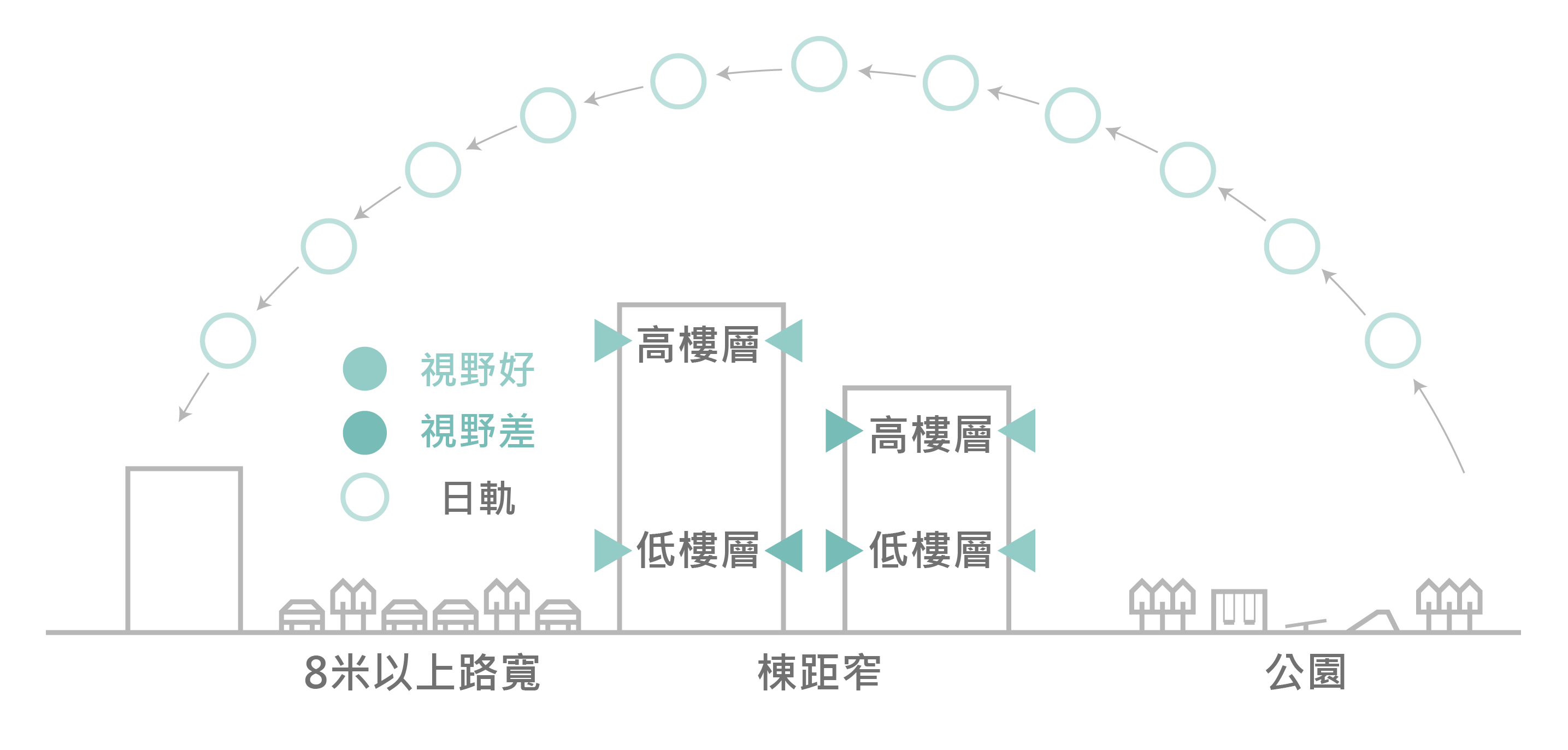 樓層與物件周遭之路寬、綠地,皆直接影響景觀與採光(如下圖),若有良好之採光與視野皆有助於估價。