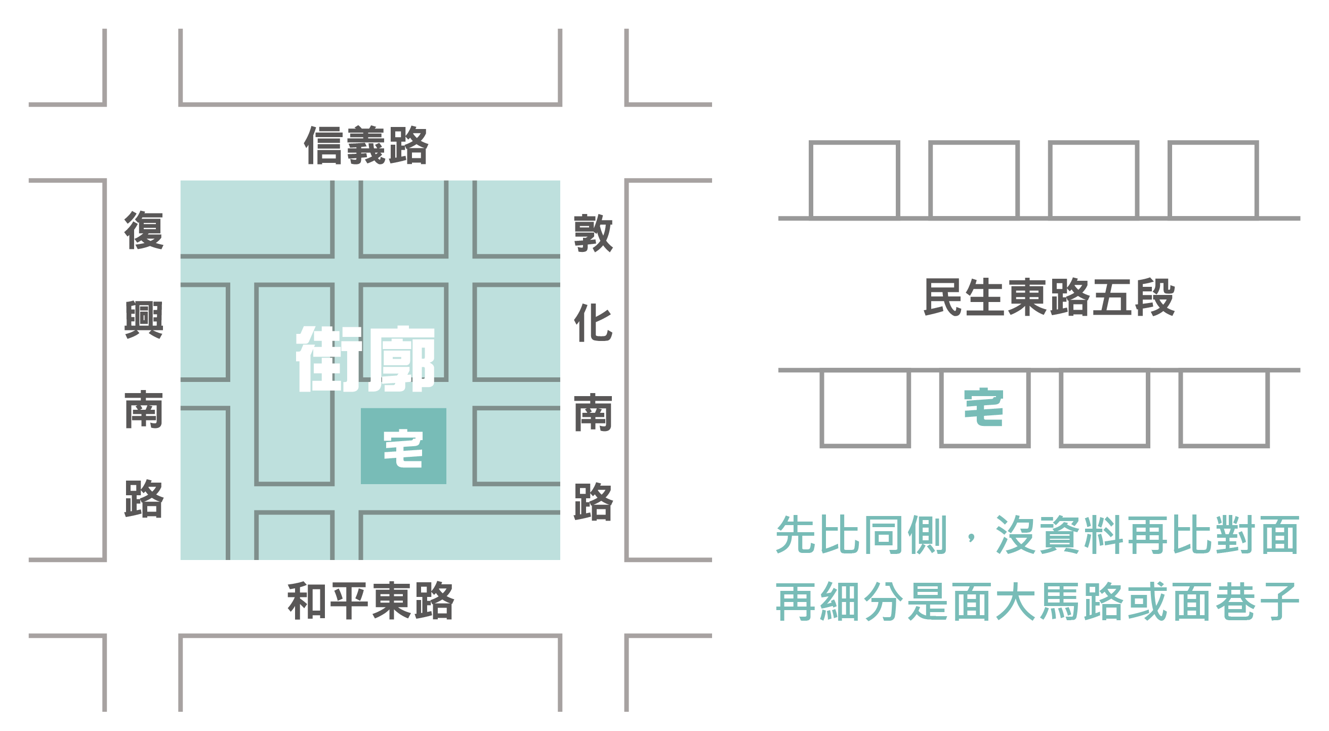 此時可將範圍向外延伸至整個街廓(四條大路包圍區來的小區域,或是同一條大馬路上之同側住宅,如下圖),若尚不足參考則再向外擴至整個行政區。